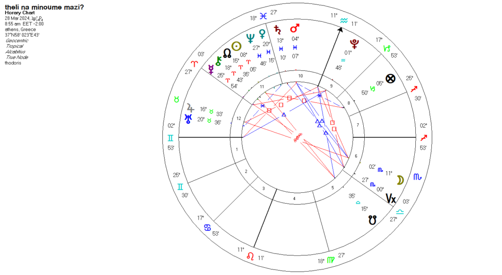 Ο ωροσκόπος του ερωτήματος βρισκόταν στις πρώτες μοίρες των Διδύμων. Αυτό είναι ένα πολύ σημαντικό στοιχείο, καθώς δείχνει ότι το ερώτημα τέθηκε νωρίς μέσα στην εξέλιξη της σχέσης. Δεν υπήρχε ακόμη πλήρης εικόνα και τα γεγονότα επρόκειτο να διαμορφωθούν.