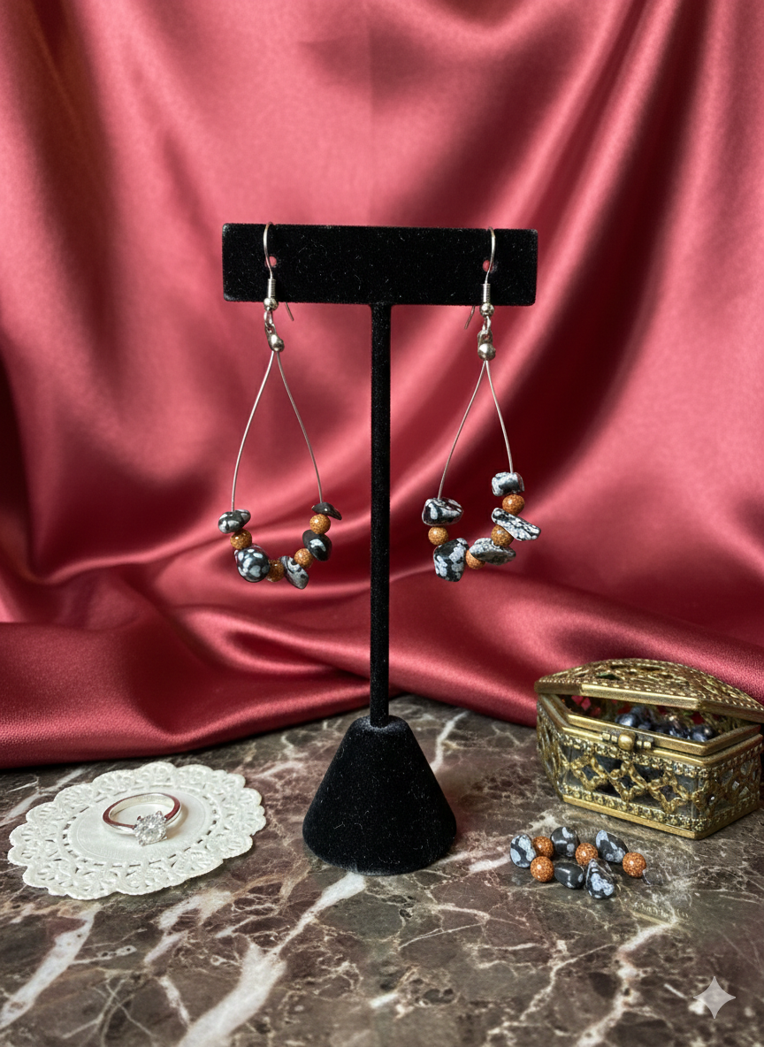 Ανακαλύψτε την απόλυτη ισορροπία μεταξύ φωτός και σκότους με αυτά τα χειροποίητα σκουλαρίκια σε σχήμα δακρύου, που συνδυάζουν τη γήινη δύναμη του Snowflake Obsidian με τη συμπαντική λάμψη του Goldstone (Χρυσόλιθου).