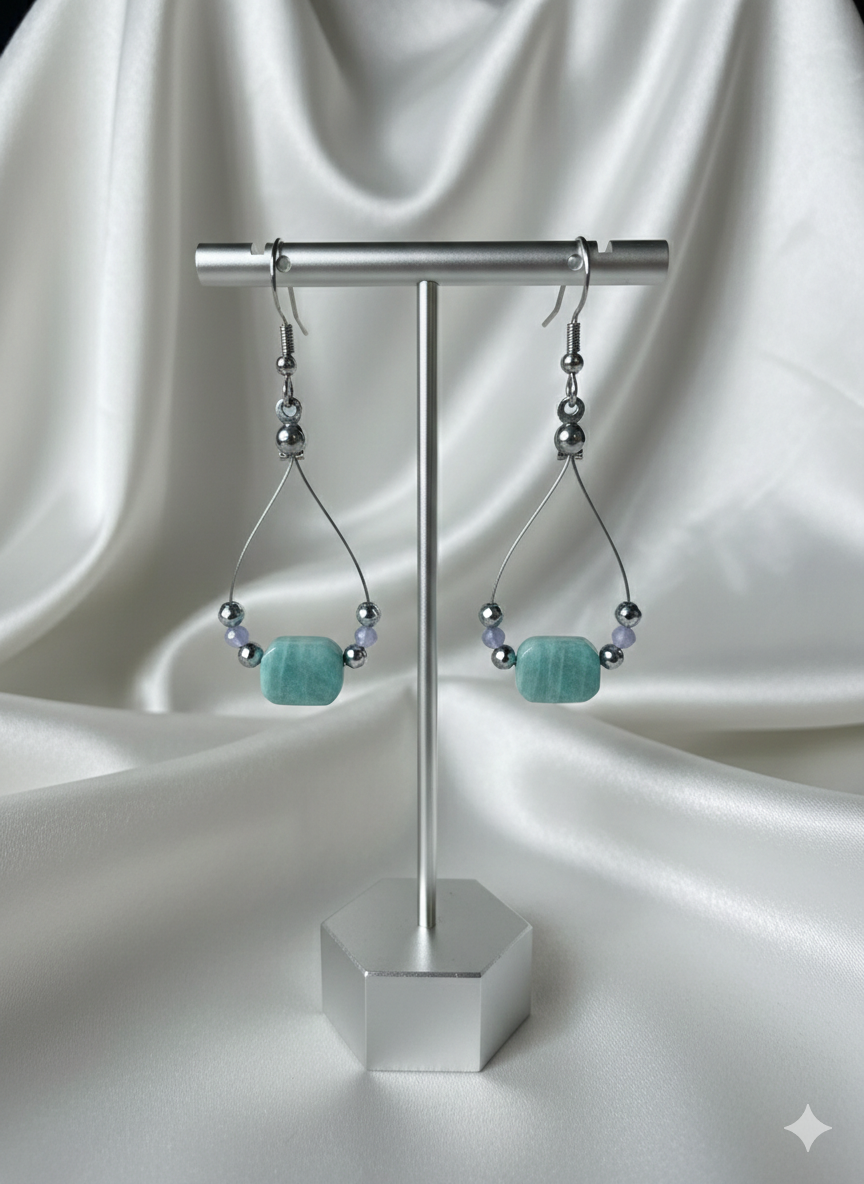 Αυτά τα σκουλαρίκια δεν περνούν απαρατήρητα. Ένας μοναδικός συνδυασμός από Αμαζονίτη, Τανζανίτη και Αιματίτη, δεμένα πάνω σε κομψούς, χειροποίητους οβάλ κρίκους. Είναι το απόλυτο αξεσουάρ για την γυναίκα που θέλει να συνδυάζει την ηρεμία των ημιπολύτιμων λίθων με την αιχμηρή αισθητική του ανοξείδωτου ατσαλιού.